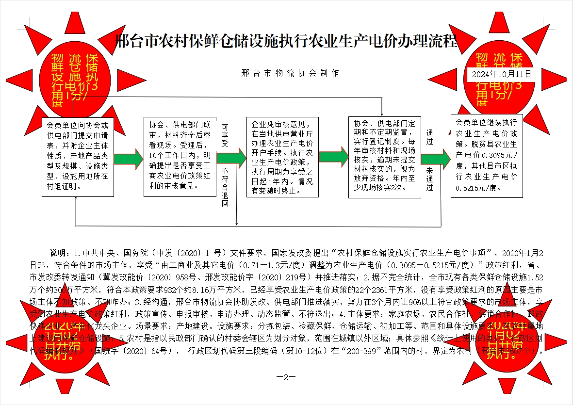 《中共中央、国务院关于抓好“三农”领域重点工作确保如期实现全面小康的意见》(中发〔2020〕l号)明确,国家支持家庭农场、农民合作社、供销合作社、邮政快递企业、产业化龙头企业建设产地分拣包装、冷藏保鲜、仓储运输、初加工等设施,对其在农村建设的保鲜仓储设施用电实行农业生产用电价格。为抓好上述政策落实,现将有关事项明确如下: